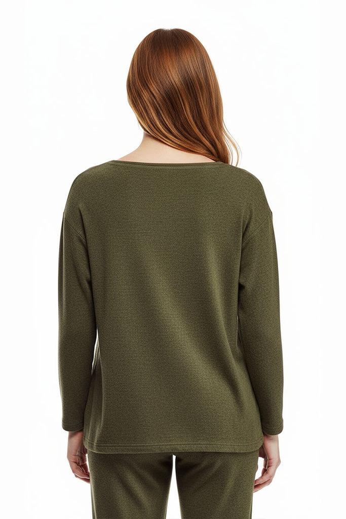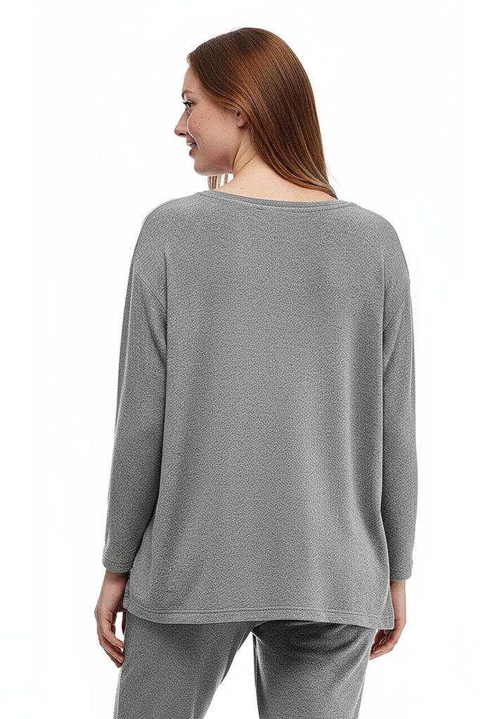 Relax and breathe deep in the simplicity and comfort of this luxe heathered pullover top. The drop shoulders, scoop neckline and wide body create a cocoon of comfort. Side seam pockets are added for extra comfort and ease. Measures 26.5" from the top of the shoulder to the bottom of the hem.
