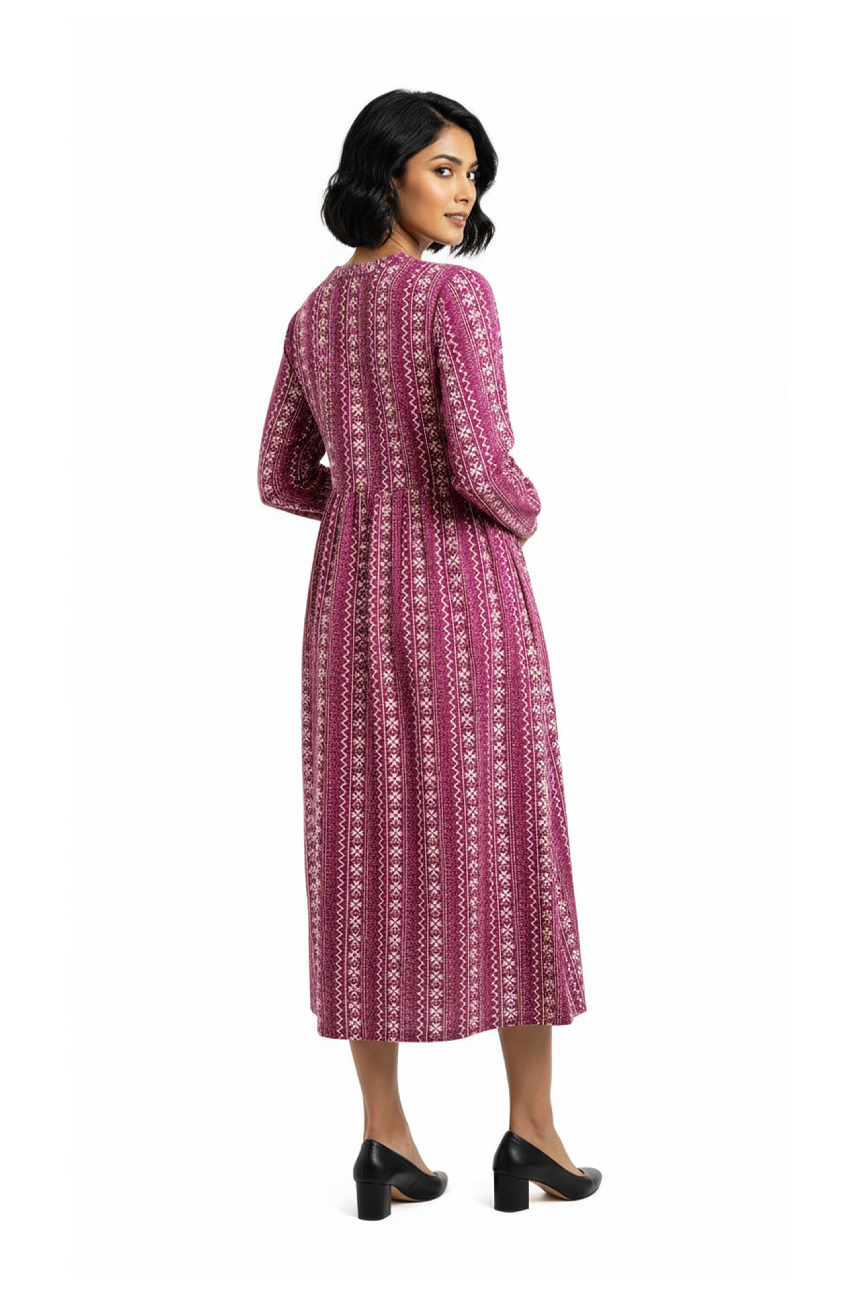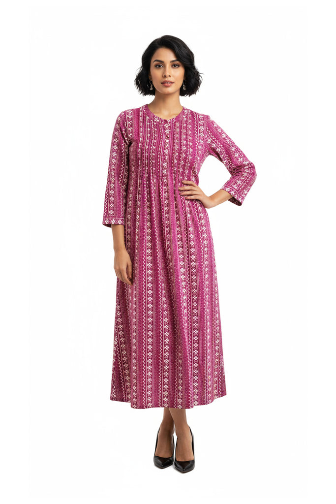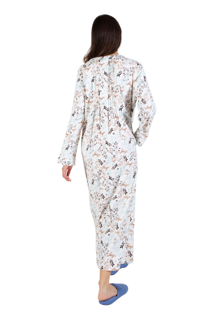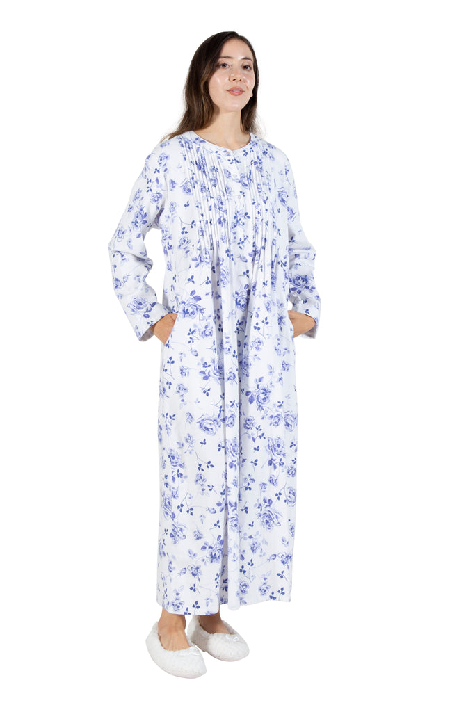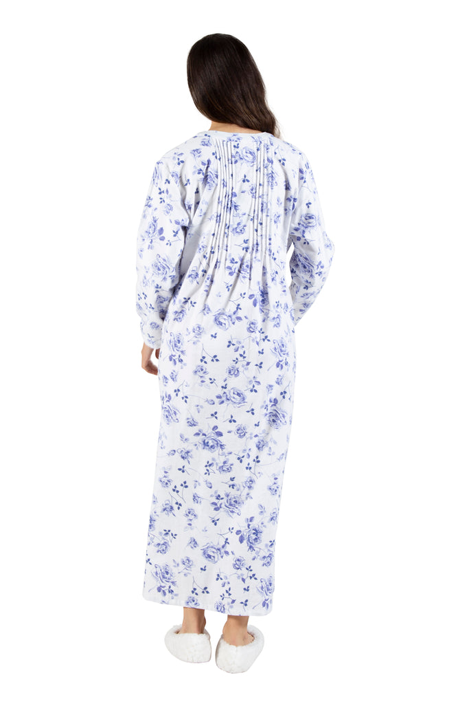 Look great and feel cozy in this Nordic Snowflake print flannel night gown by La Cera. This gown features flattering front pleats at front and back yokes which provide plenty of fullness in the bodice. The button front placket makes it a breeze to put on and take off. Side seam pockets are added for small items such as a phone or tissues.