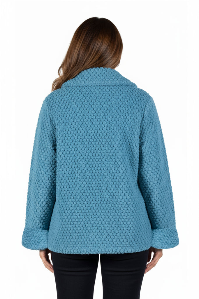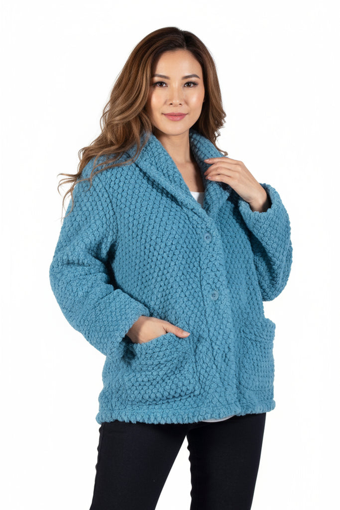 Feel cozy and stylish with La Cera's Honeycomb Fleece Bed Jacket. This lightweight jacket features a notched collar for added flair and convenience. Made of 100% polyester, it has long sleeves and two front pockets for both practicality and comfort. Perfect for indoor and outdoor wear with its 3 button down design. Imported.