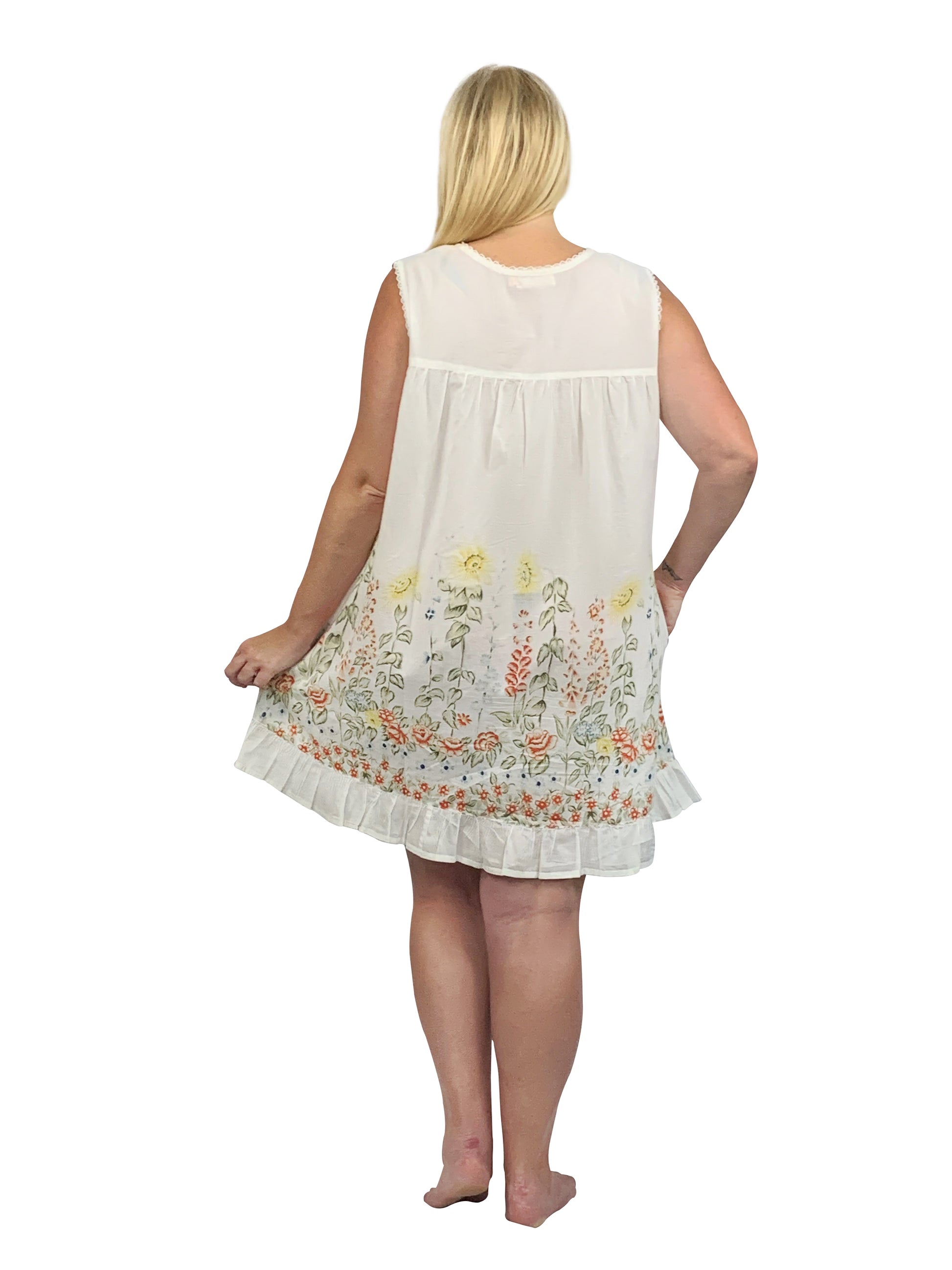 Indulge in comfort and style with the La Cera Sunflower Garden Cotton Chemise. Made from soft 100% cotton woven fabric, this chemise features a front yoke trimmed with pintucks, ribbon, and lace beading, as well as a button front placket with 3 pearlized buttons. Gentle shirring under the yoke line and a ruffle trim at the shirttail hem provide a flattering and feminine touch. Plus, with handy side seam pockets, this chemise is both practical and luxurious. Imported
