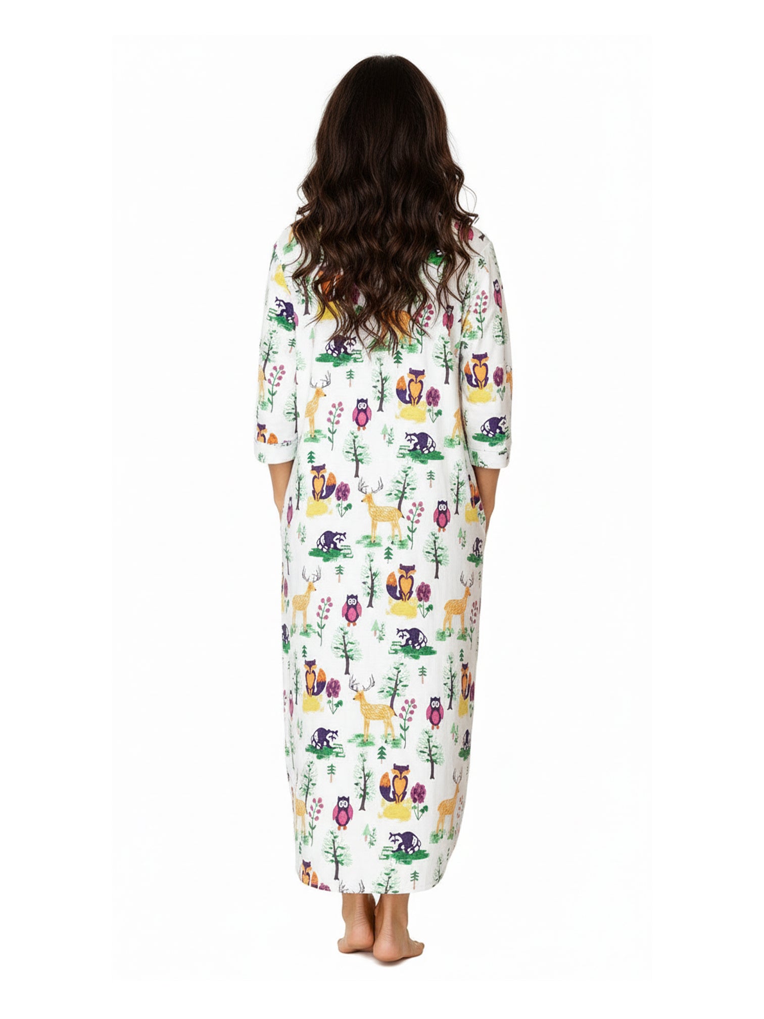 Este camisón de manga larga presenta un encantador estampado de animales del bosque y un cierre de cuatro botones en el escote redondo. Este camisón también cuenta con dos bolsillos laterales.