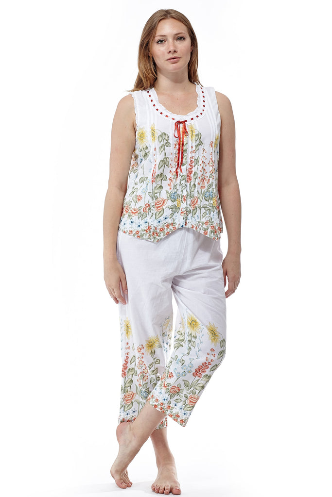 This beautiful floral printed pajama set features a sleeveless top with ribbon detail and button closure and matching pants. Comfortable, lightweight, and chic, your search for the perfect pair of pajamas is over!