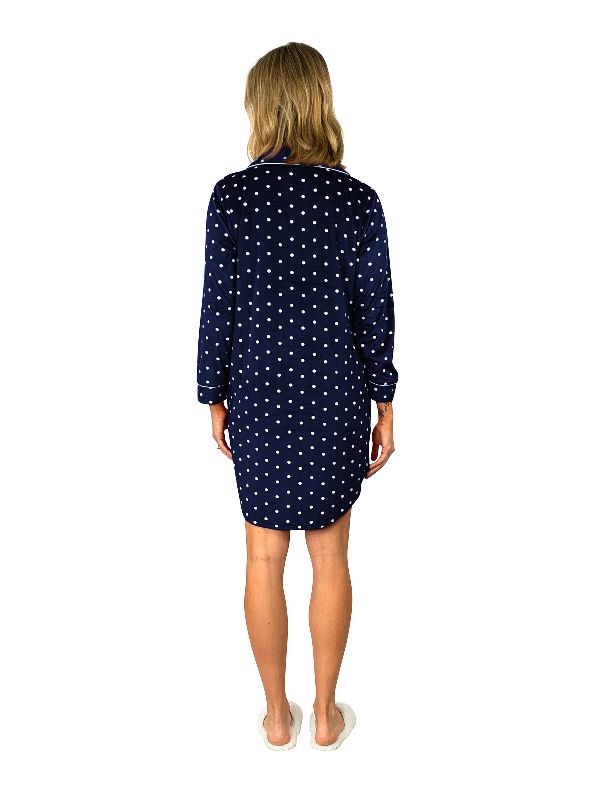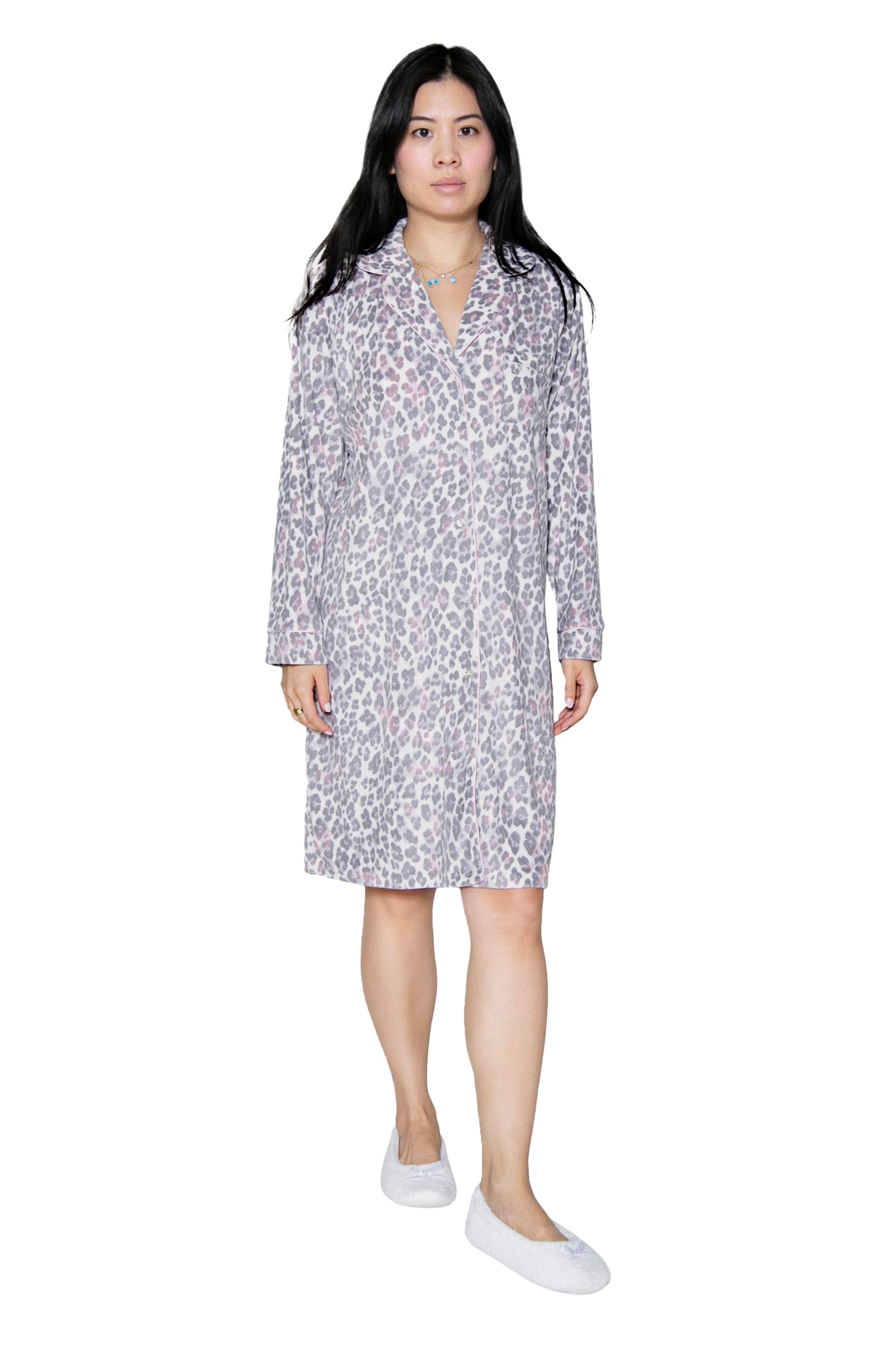 This classic nightshirt from La Cera is made of the lightest yet silkiest fleece we could find. The featherweight fabric is sheered so it is super soft, yet will keep you warm and cozy. The rounded shirt collar, button front placket and breast pocket are all trimmed with white satin piping. The 36" length falls just above the knees on most, making it easy to walk and not get tangled up while sleeping.