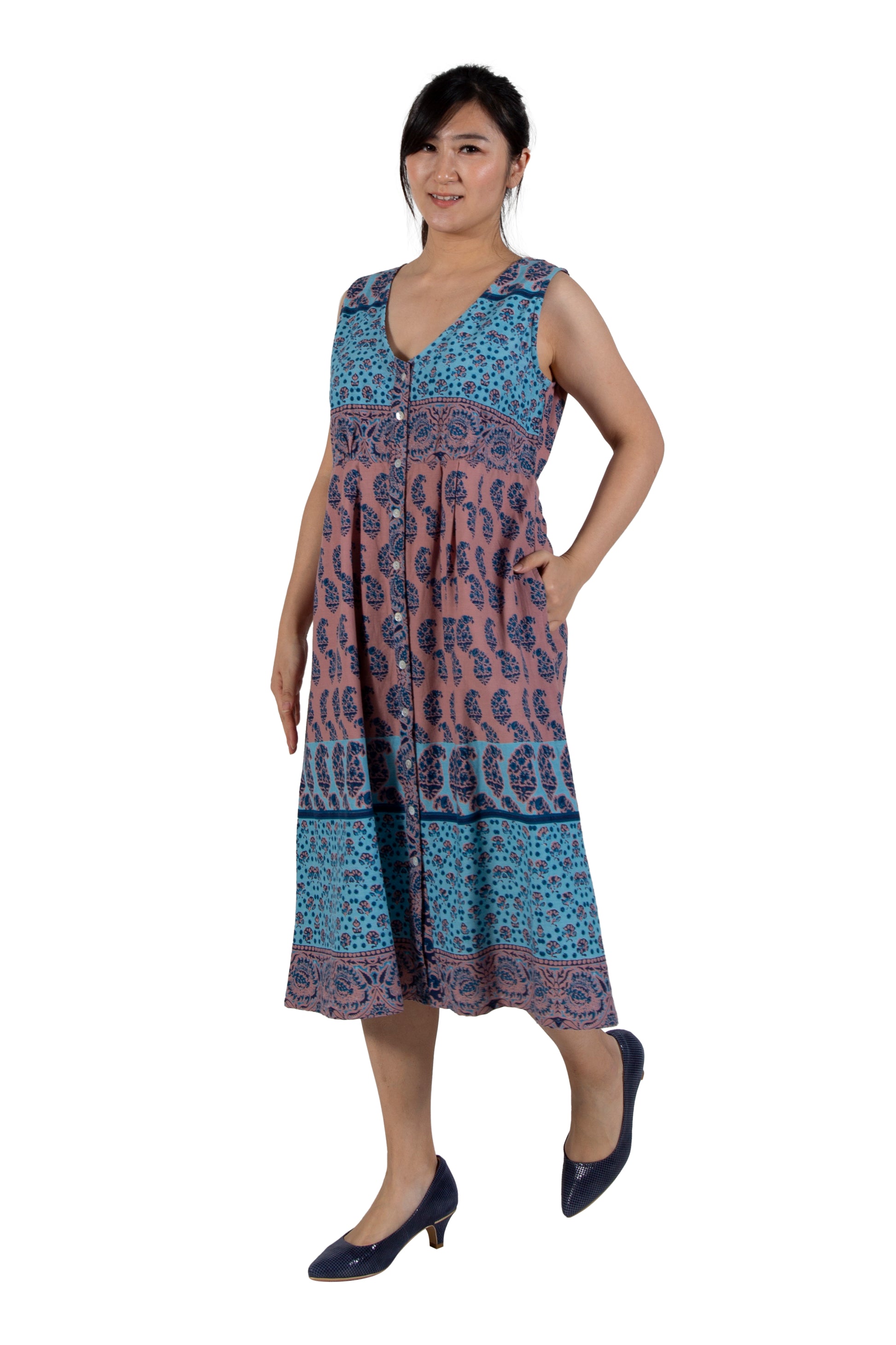 This sleeveless dress is made from lightweight and breathable 100% cotton fabric. The vintage block print designs add a touch of nostalgia. Perfect for warm weather, the dress features a V-neckline and is bra friendly. Plus, the full button front placket makes it easy to put on and take off. Side seam pockets added for small items. Imported.