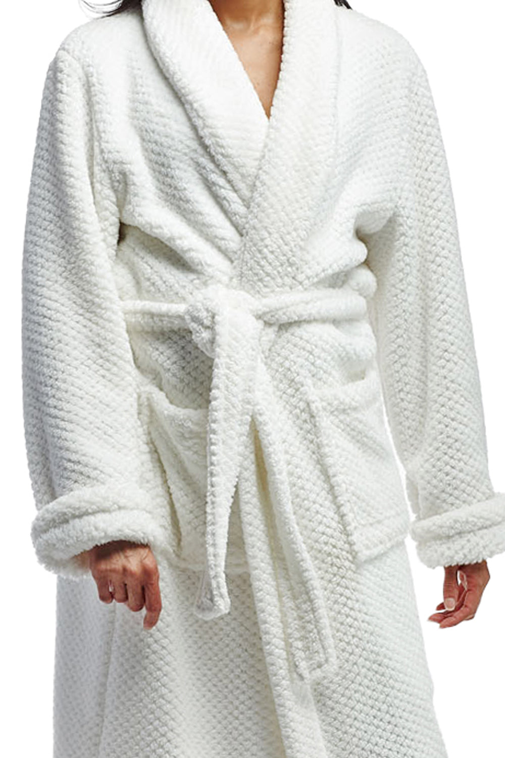 Look stylish before bed with this La Cera bath robe crafted from 100 percent polyester fleece with a unique honeycomb pattern. It features two front patch pockets and a belt to keep you toasty and warm. Available in pure white or ice blue to bring this night look together.