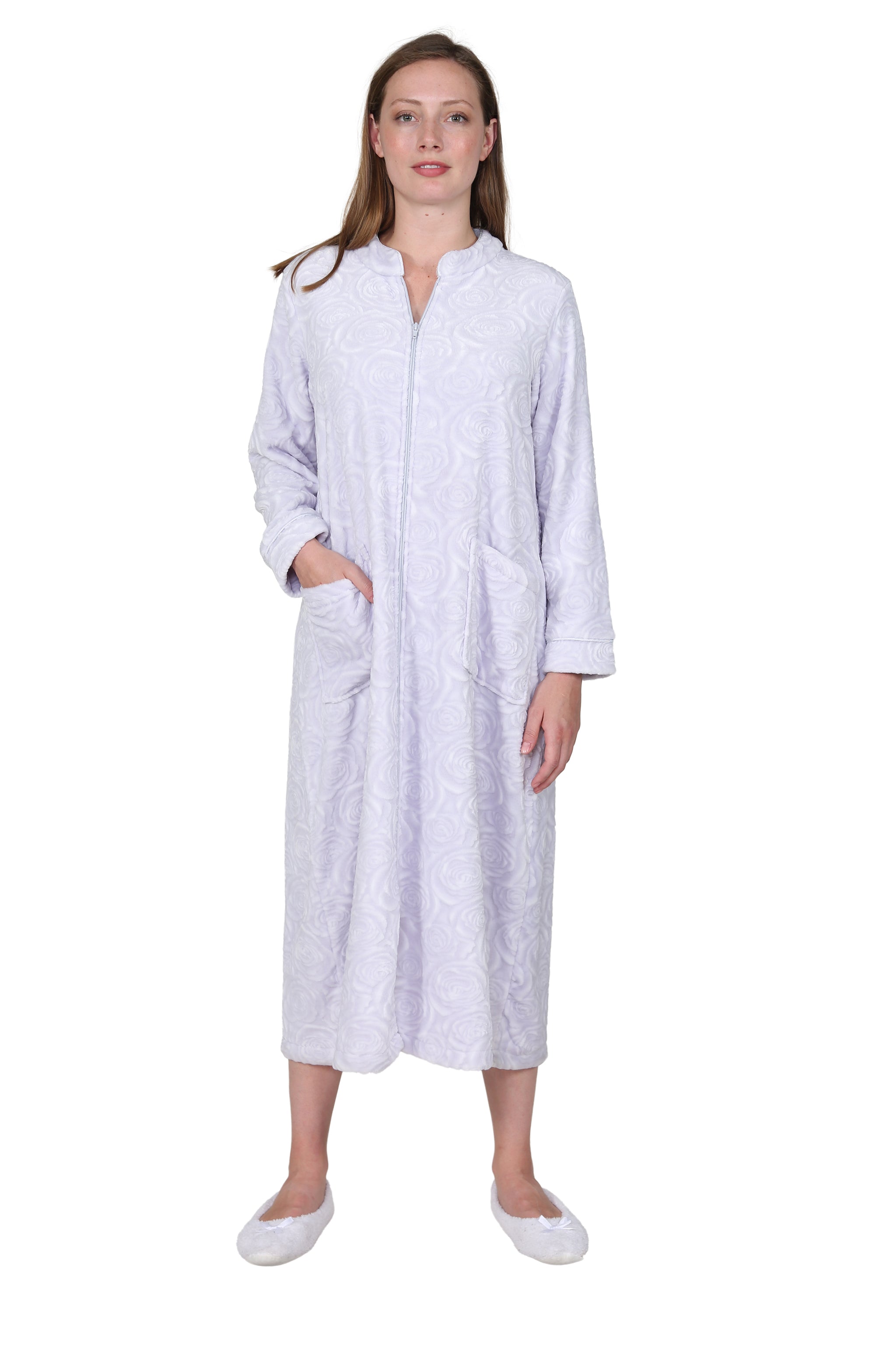 This extra cozy robe features beautiful textured rose fabric and two front pockets for ideal everyday wear. A front zipper closure offers effortless coverage and is accented with a tassel detail. Machine washable.