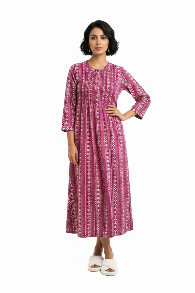 Look great and feel cozy in this Nordic Snowflake print flannel night gown by La Cera. This gown features flattering front pleats at front and back yokes which provide plenty of fullness in the bodice. The button front placket makes it a breeze to put on and take off. Side seam pockets are added for small items such as a phone or tissues.