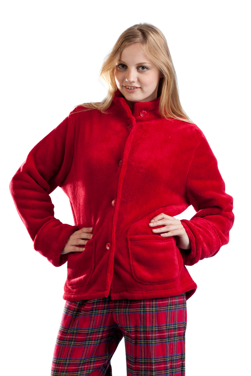 You won't believe how plush and silky this fabric is! Warm and soft, this jacket from La Cera features a stylish stand collar. With two front patch pockets and coordinating buttons, this plush jacket is finished with long sleeves. 100% Polyester.