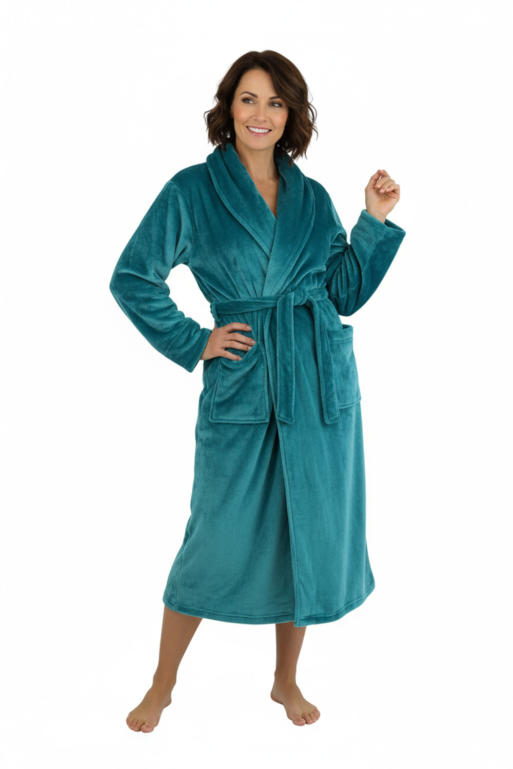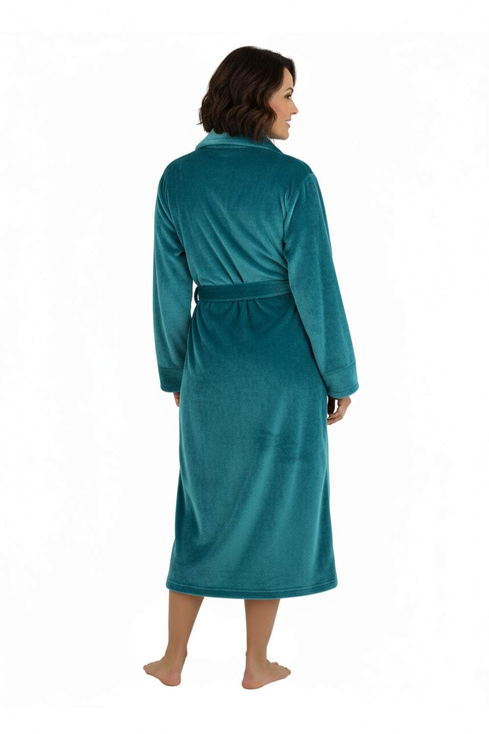 Soft and luxurious, this spa robe from La Cera is made of the silkiest plush fabric we could find. With two front patch pockets and a self-tie belt, this robe is finished with a shawl collar. An inside tie is also included.