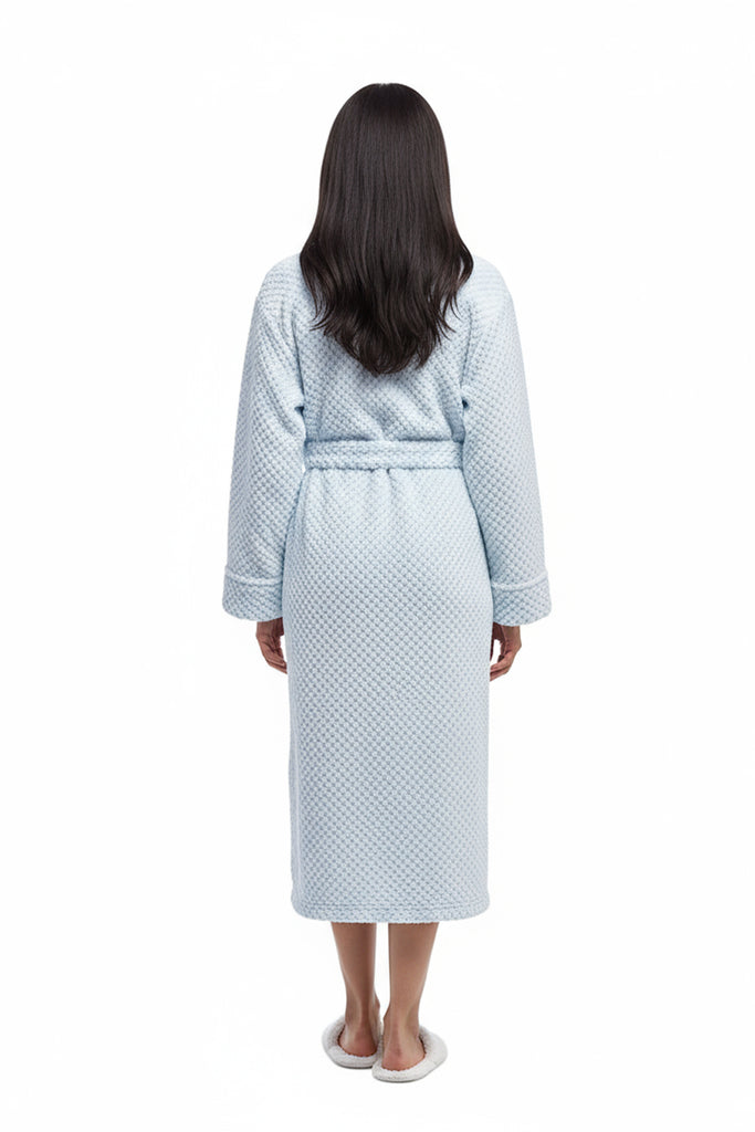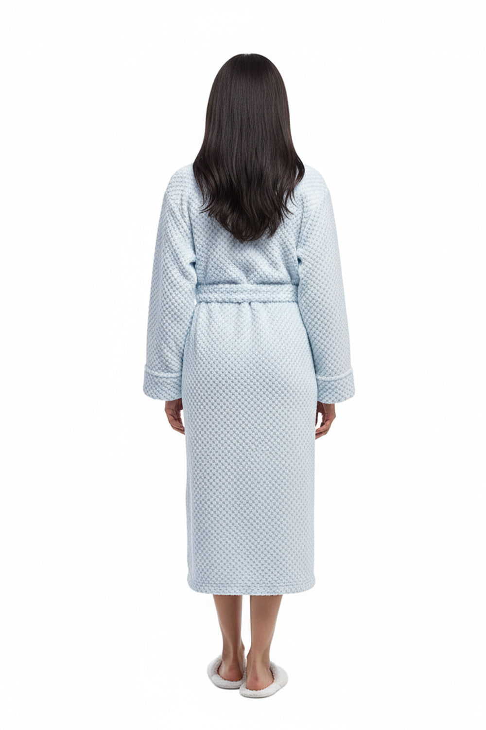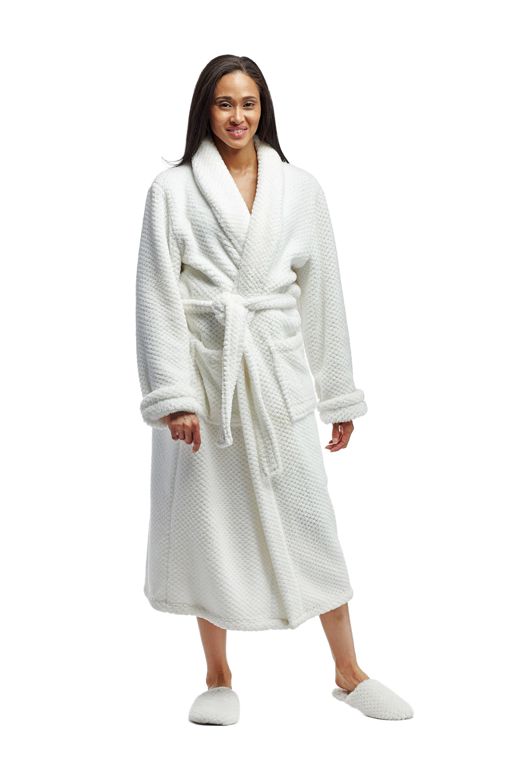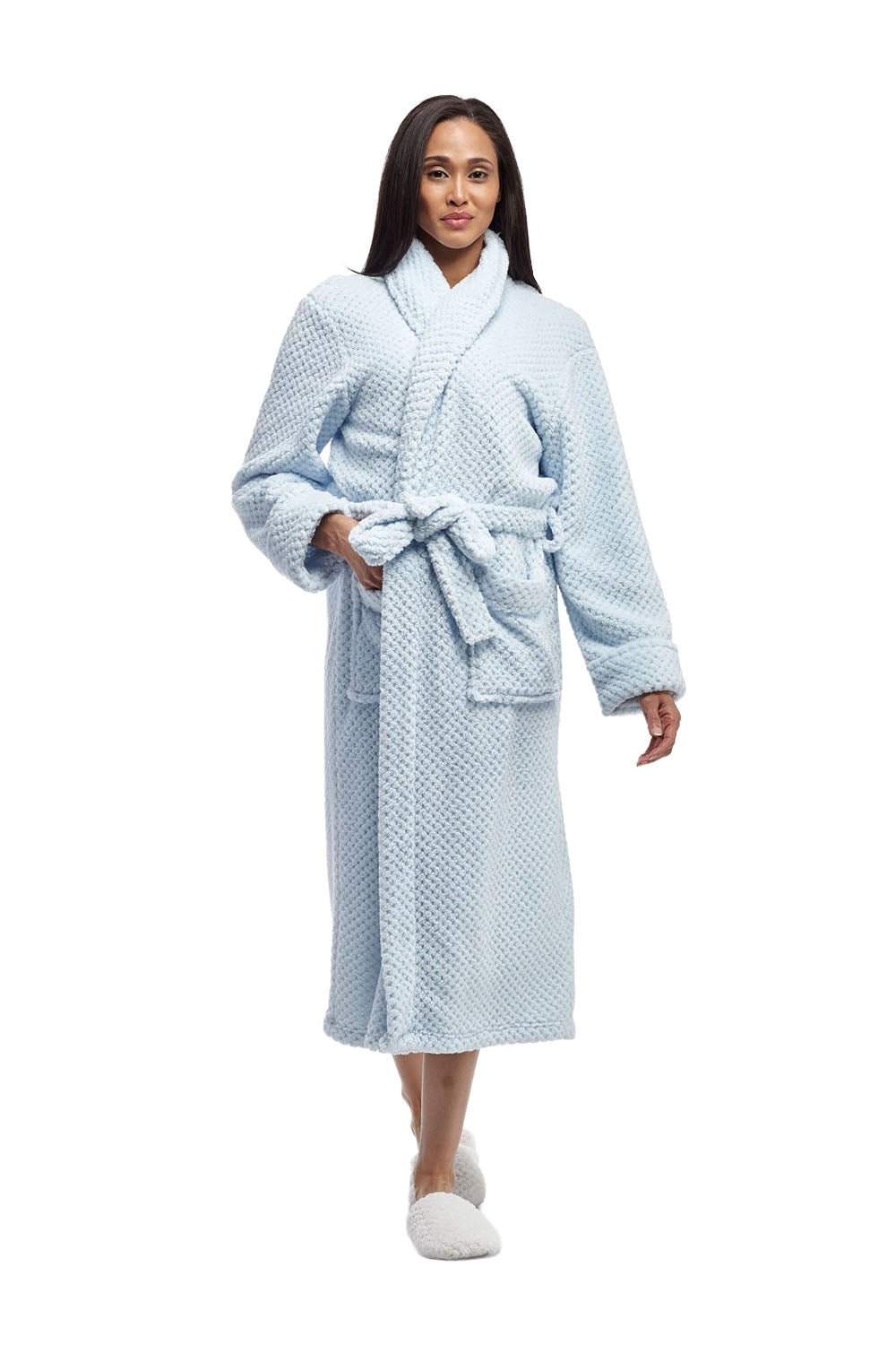 Look stylish before bed with this La Cera bath robe crafted from 100 percent polyester fleece with a unique honeycomb pattern. It features two front patch pockets and a belt to keep you toasty and warm. Available in pure white or ice blue to bring this night look together.