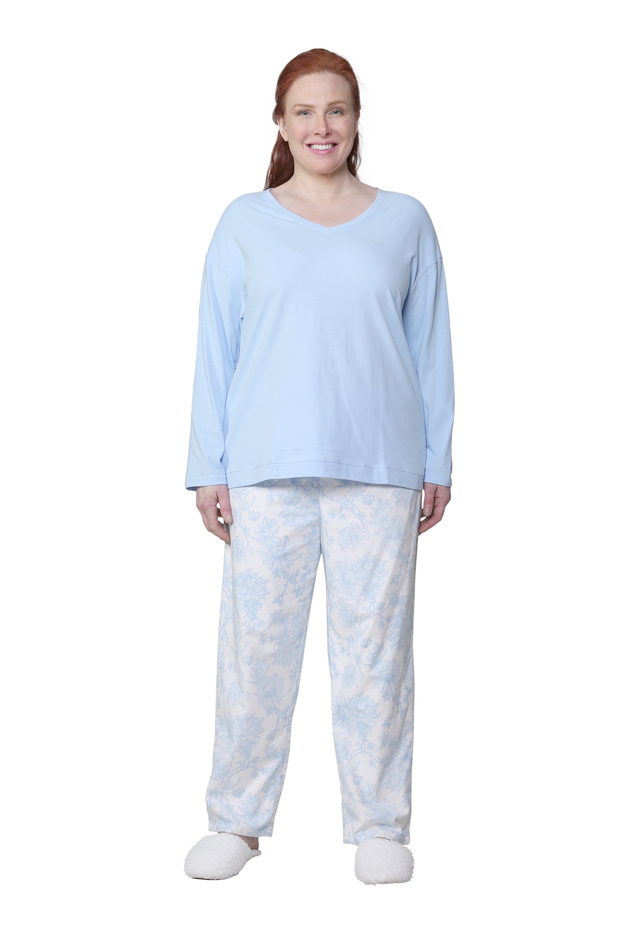 Snuggle up in comfort with this Plus Size pajama set from La Cera. The 100% cotton knit jersey top is lightly brushed for added warmth and comfort, like a lived in tee shirt. The pant is made from double brushed 100% Cotton flannel and hosts a botanical floral toile print in a coordinating color. The pant has an elasticized waist with a drawstring for added comfort.