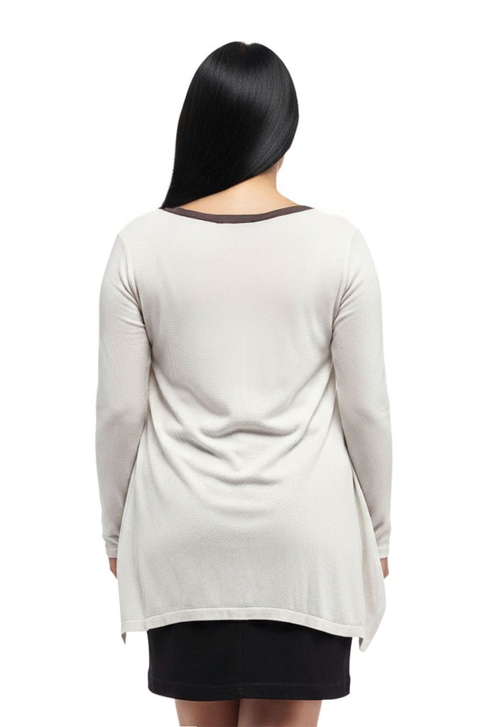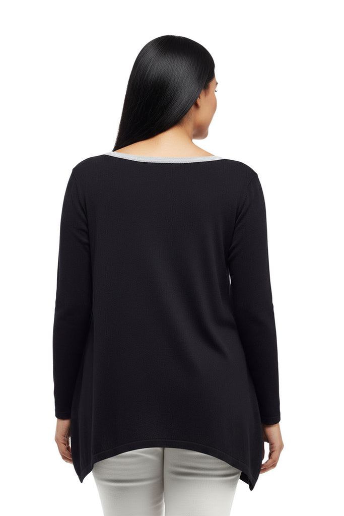 This La Cera pullover sweater top features long sleeves and a contrasting collar. It also features a high-low hemline and a round neckline.