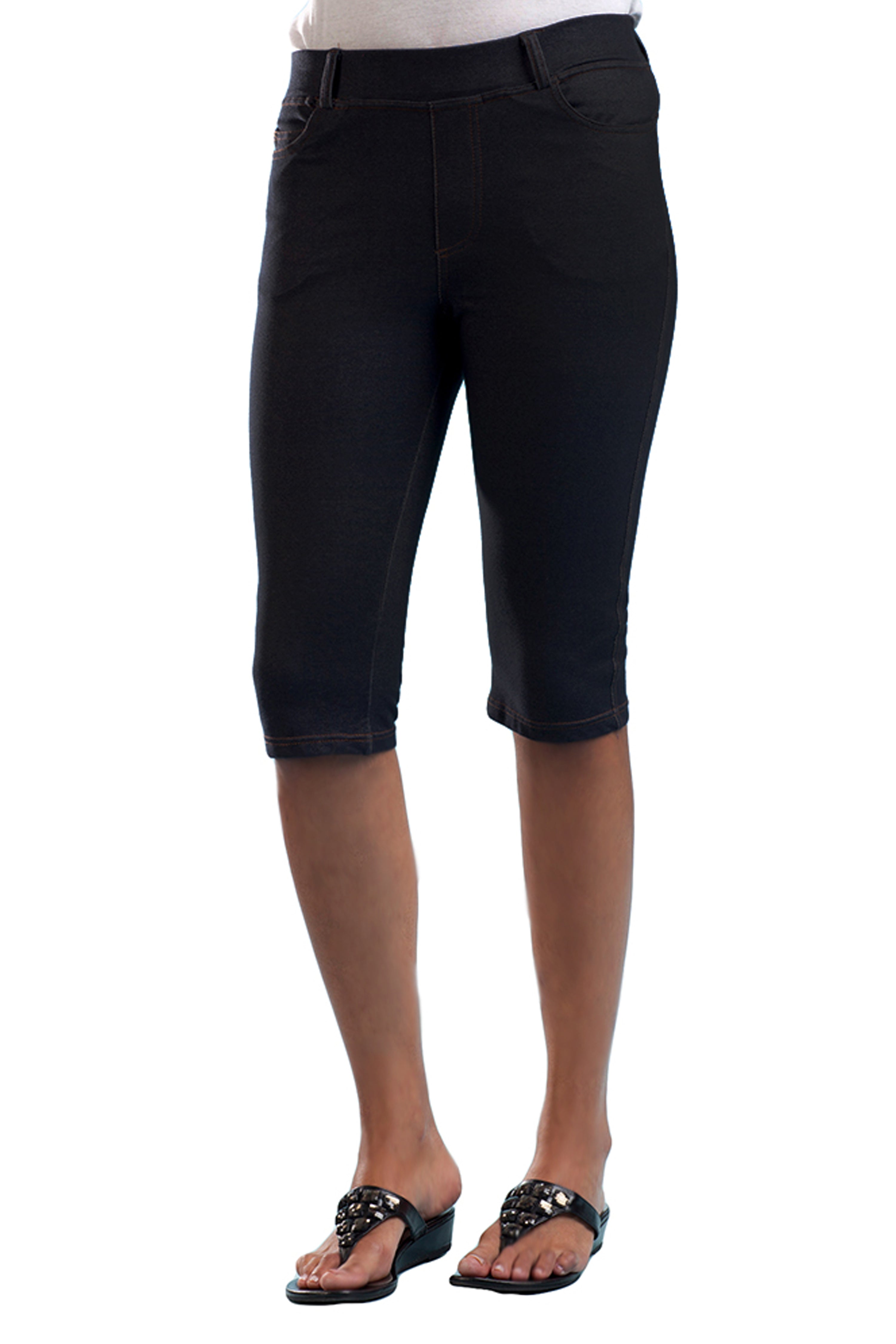 The quintessential Capri. Comfortable stretch knit has the appearance of denim. Features 2" covered elastic waistband with belt loops. Convenient 5 pocket styling with mock fly and contrast stitching.