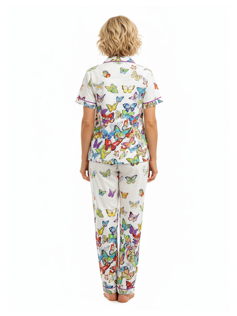 Experience ultimate comfort and style with La Cera's 100% cotton PJ set. Featuring a notched collar, functional drawstring waistband, and full button front with 5 buttons, this set is perfect for lounging or sleeping. With a beautiful butterfly garden design and cute details like a breast pocket and sleeve cuffs, you'll never want to take it off. (PJs so perfect, you'll dream about them!). Imported.