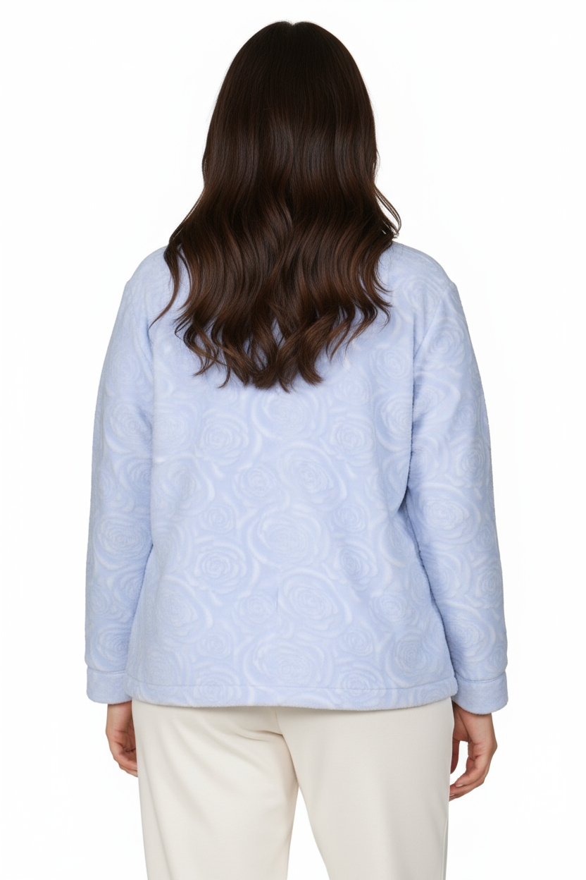 Stay cozy and stylish in the Plus Size LA CERA Fleece Rose Sculptured Bed Jacket. With its elegant rose design, button closure, Mandarin collar, and front pockets, this bed coat is perfect for adding a touch of class to your sleepwear. Its long sleeves provide extra warmth and comfort.