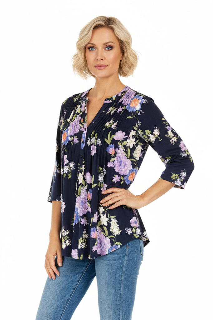 Elevate your style with our La Cera Plus Size Pleat Front Top. The sophisticated 3 button front placket and banded neckline with release pleats add a touch of luxury. Wrinkle resistant and perfect for travel, this top is both functional and elegant with its shirt tail hemline.