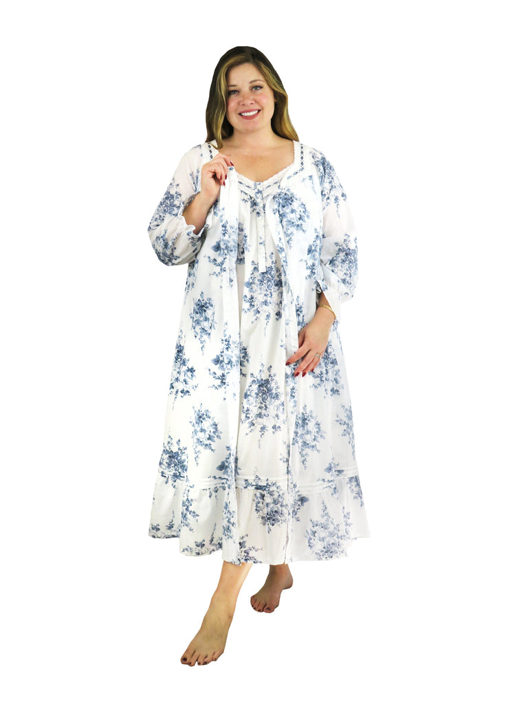 Esta bata clásica cubierta con un precioso estampado floral es un complemento perfecto para el guardarropa de cualquier mujer. Está confeccionado en 100% algodón con un suave encaje de algodón en el escote en forma de corazón adornado con una cinta azul. Presenta una tapeta con botones en la parte delantera, bolsillos laterales en las costuras y una silueta de barrido completo para brindar mucho espacio para moverse.
