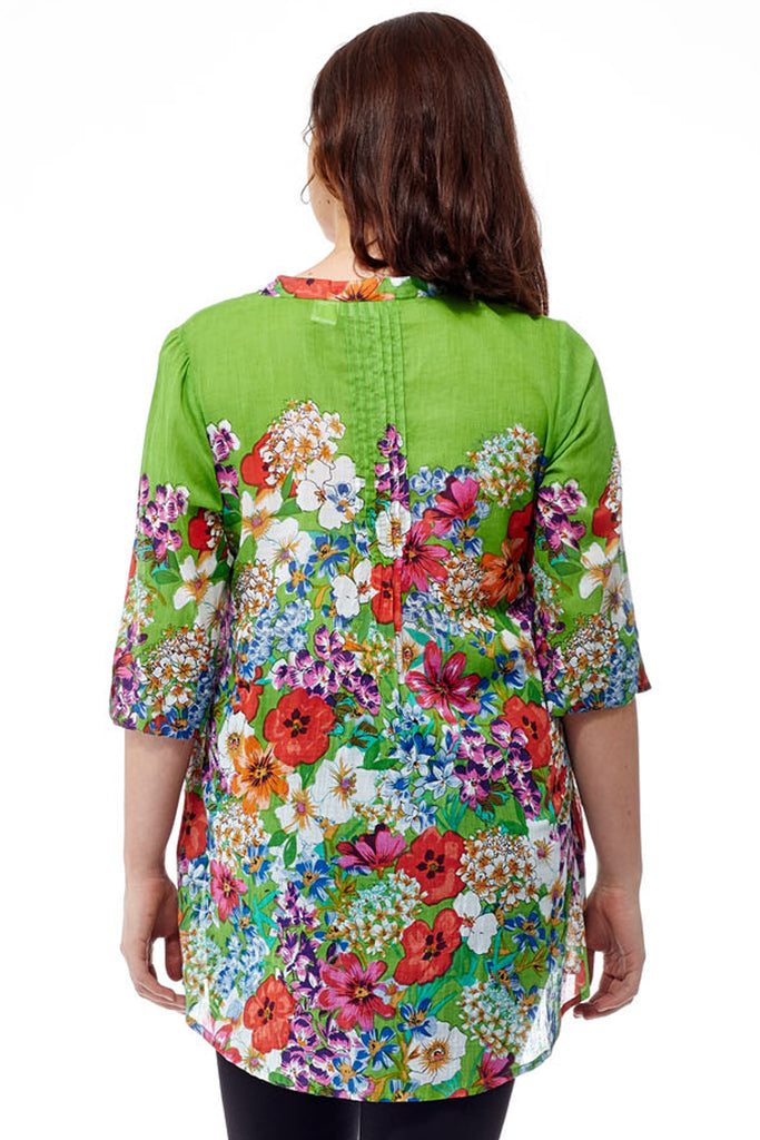 ¡Esta colorida túnica floral de La Cera es el toque de color y estilo que estabas buscando! Esta túnica de ajuste sencillo presenta un frente con botones plisados y prácticos bolsillos laterales, perfectos para cualquier ocasión.
