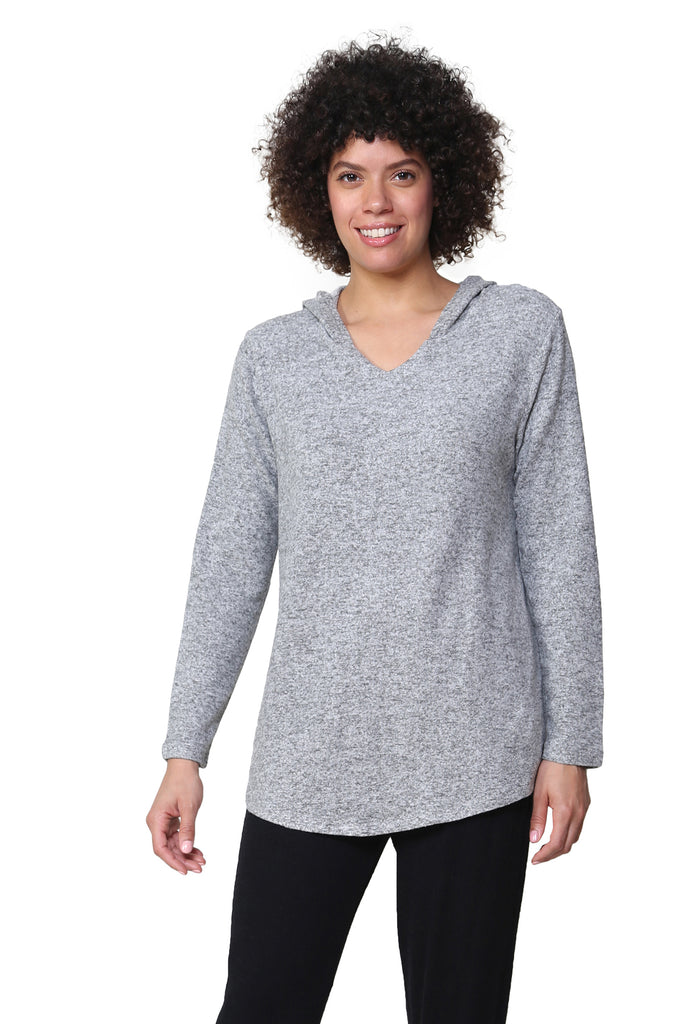 This cozy hooded tee from the Comfort Collection is the perfect compliment to any outfit. Soft Rayon blended knit has just enough Spandex to always keep its shape. It's so comfy you'll never want to take it off! Features a full hood, side pockets & a curved shirt tail hemline.