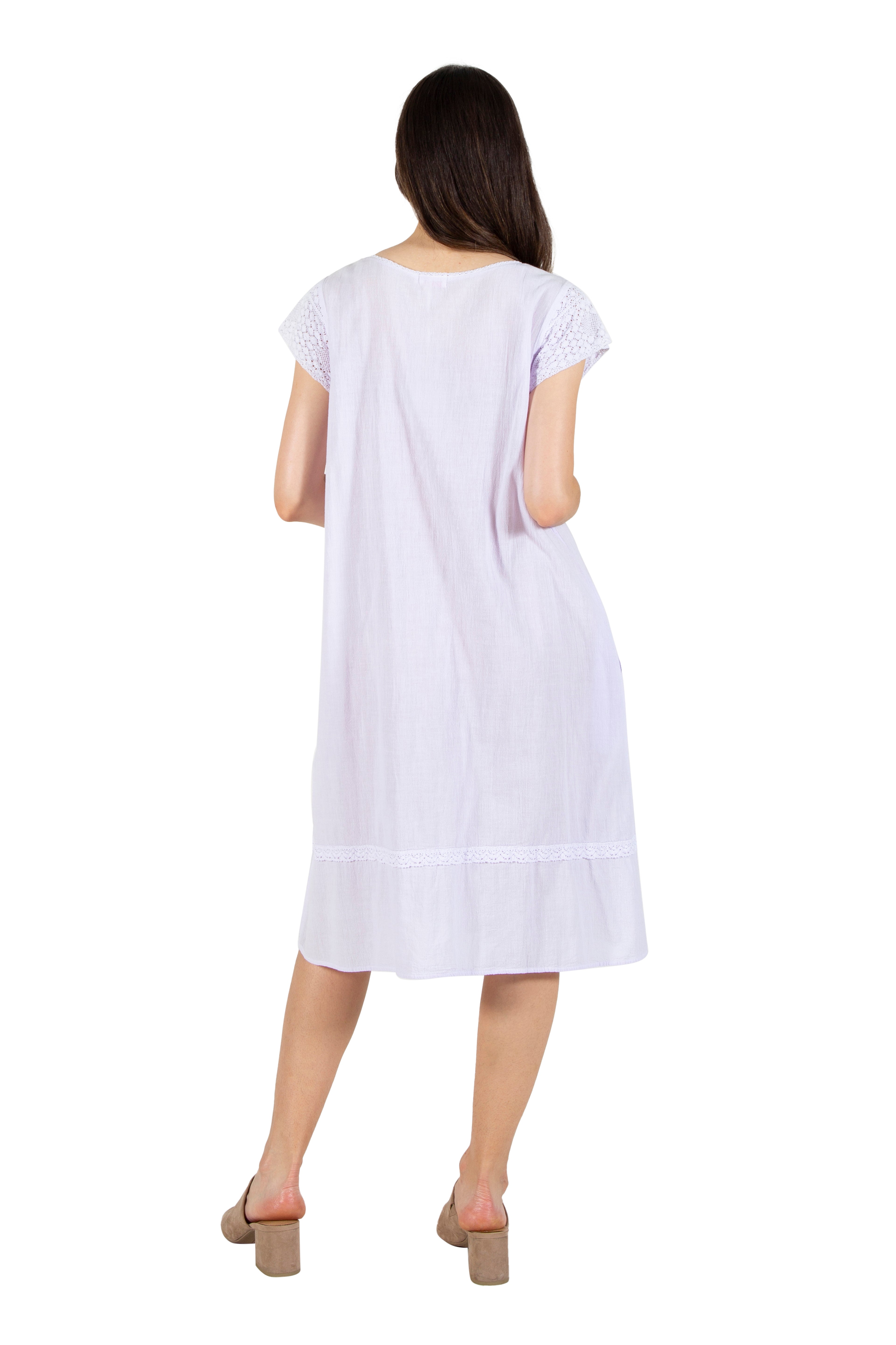 Soft, airy and lightweight cotton gauze is the perfect fabric for a good night's sleep. This gown features hand embroidery on a bib yoke and a scoop neckline. The cap sleeves are created from 100% Cotton lace, and the hemline is trimmed with a cotton lace edge. Side seam pockets are added for convenience. Machine wash, tumble dry.