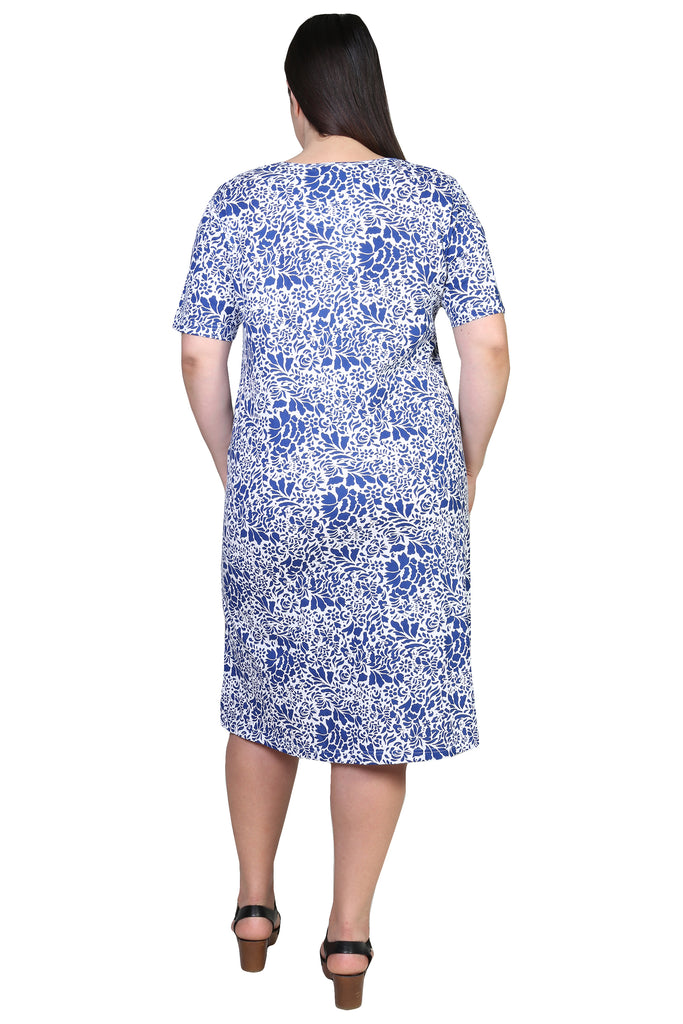 Add comfort and color to your style with our La Cera knit dress in a flattering a-line silhouette. Made of 100% cotton knit jersey, this round neck dress features a stylized monotone floral pattern, short sleeves, and side seam pockets.
