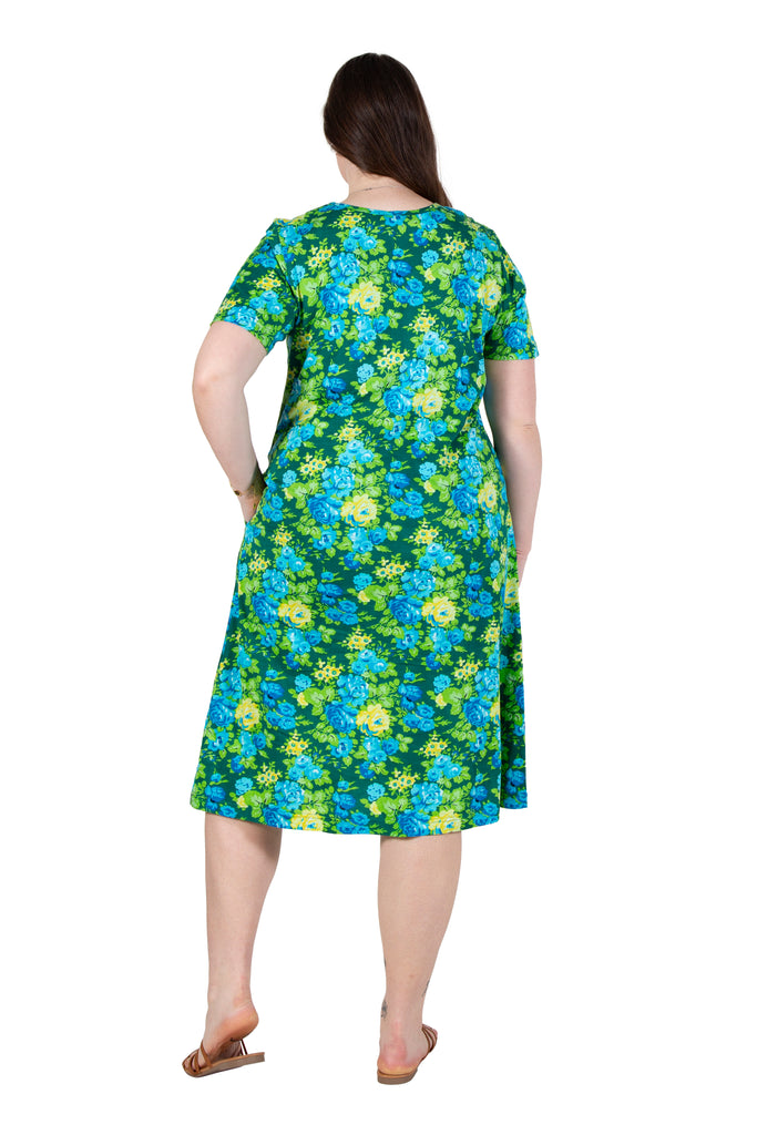 Add comfort and color to your style with our La Cera knit dress. Made of soft pre-washed 100% cotton jersey, this scoop neckline dress features a vibrant floral pattern, short sleeves, and side seam pockets.