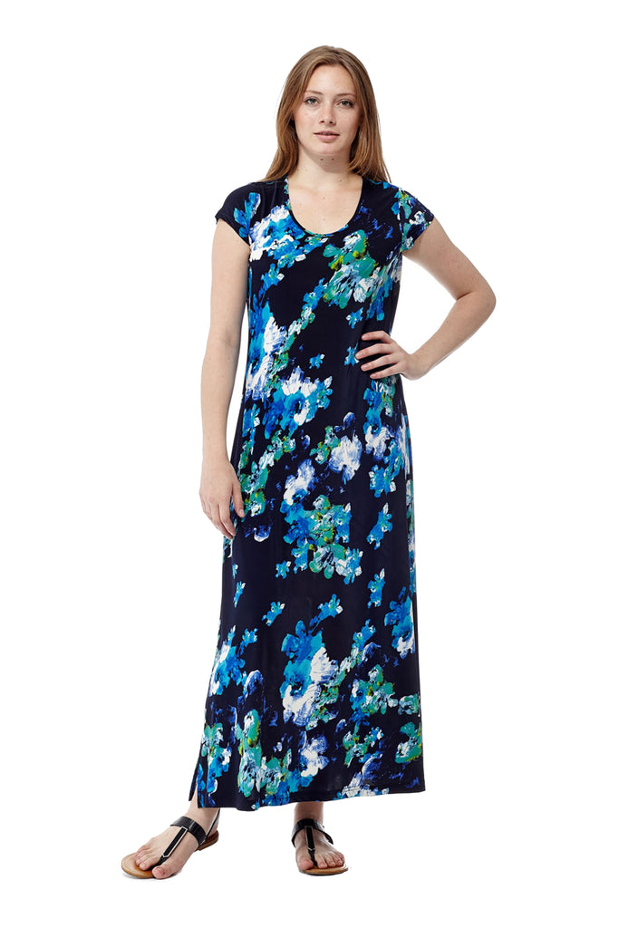 Enjoy the bold pattern and comfortable feel of this La Cera maxi dress. In a bold yet feminine floral watercolor pattern, this dress has a scoop neckline and cap sleeves.  Easy care and great for travel.