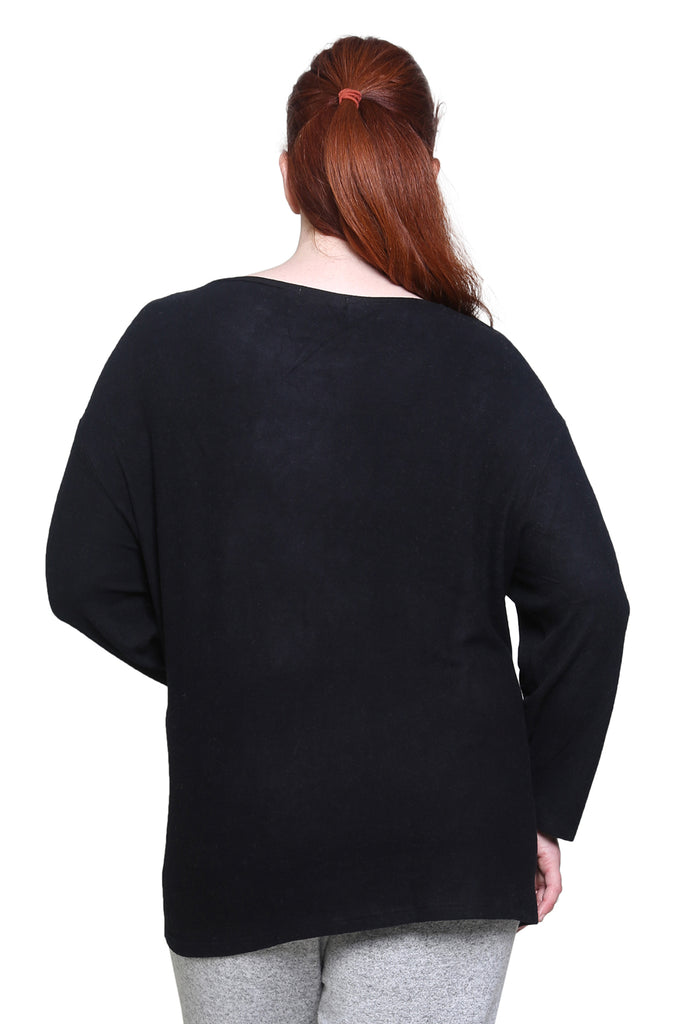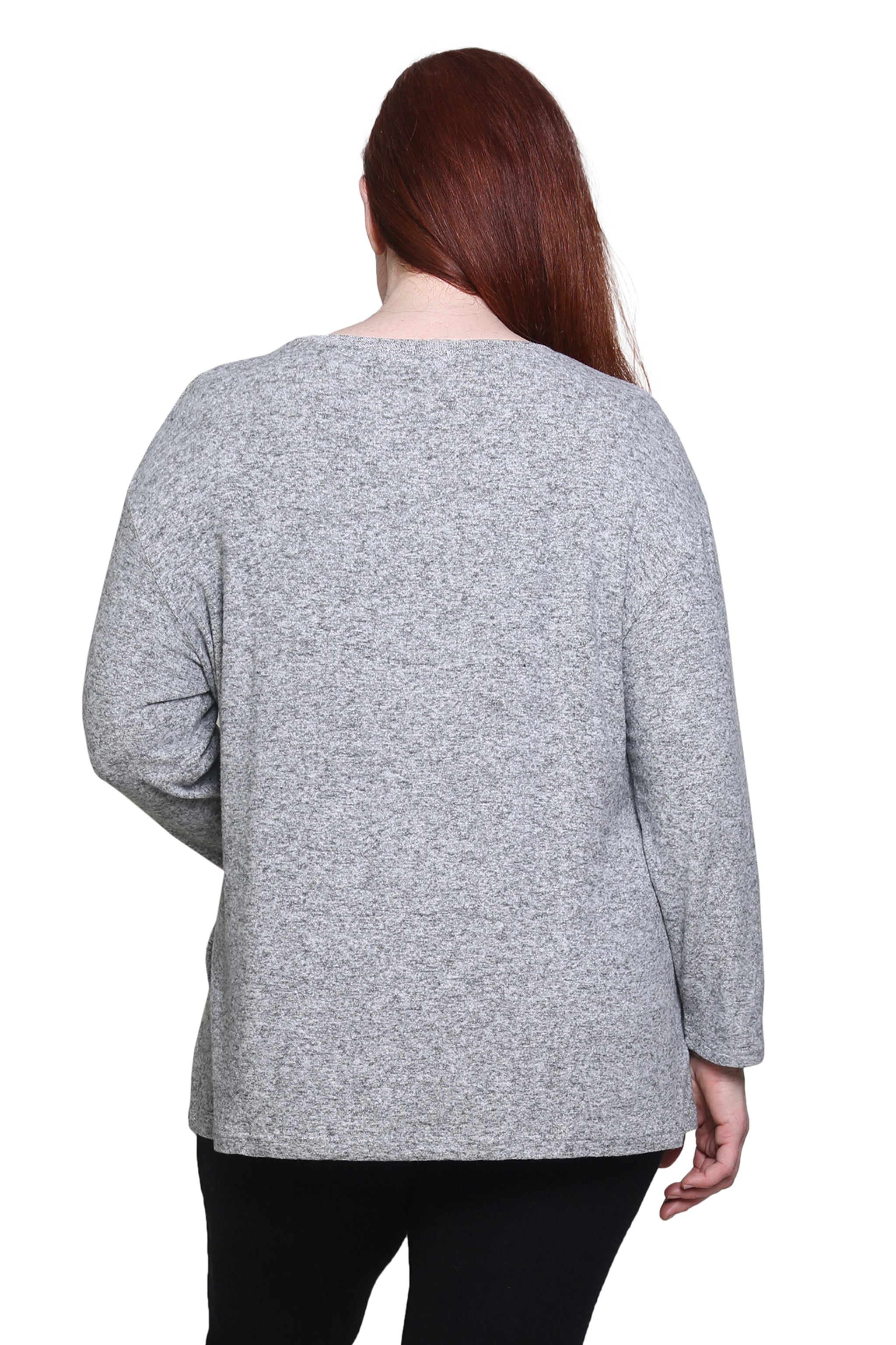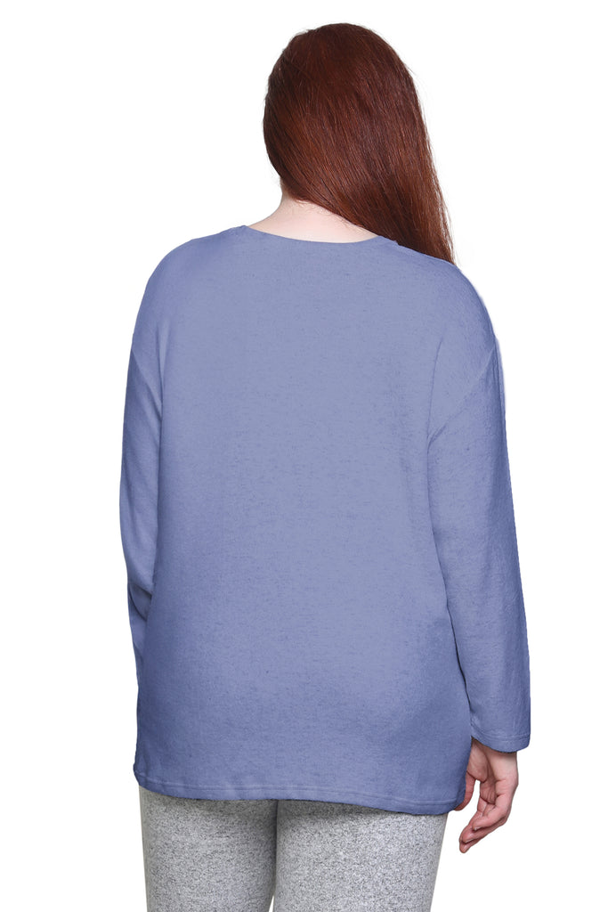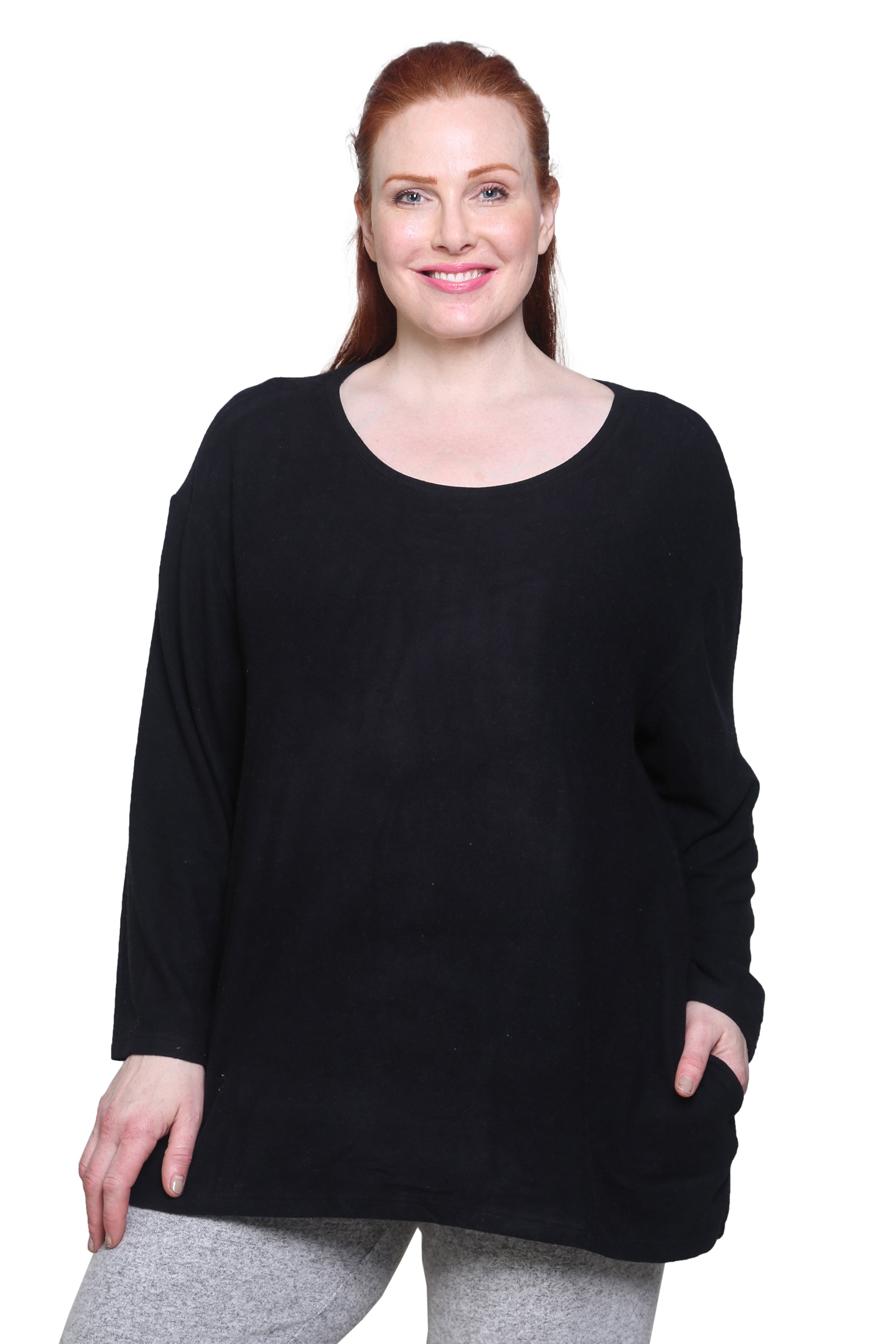 Relax and breathe deep in the simplicity and comfort of this luxe heathered pullover top. The drop shoulders, scoop neckline and wide body create a cocoon of comfort. Side seam pockets are added for extra comfort and ease. Measures 26.5" from the top of the shoulder to the bottom of the hem.